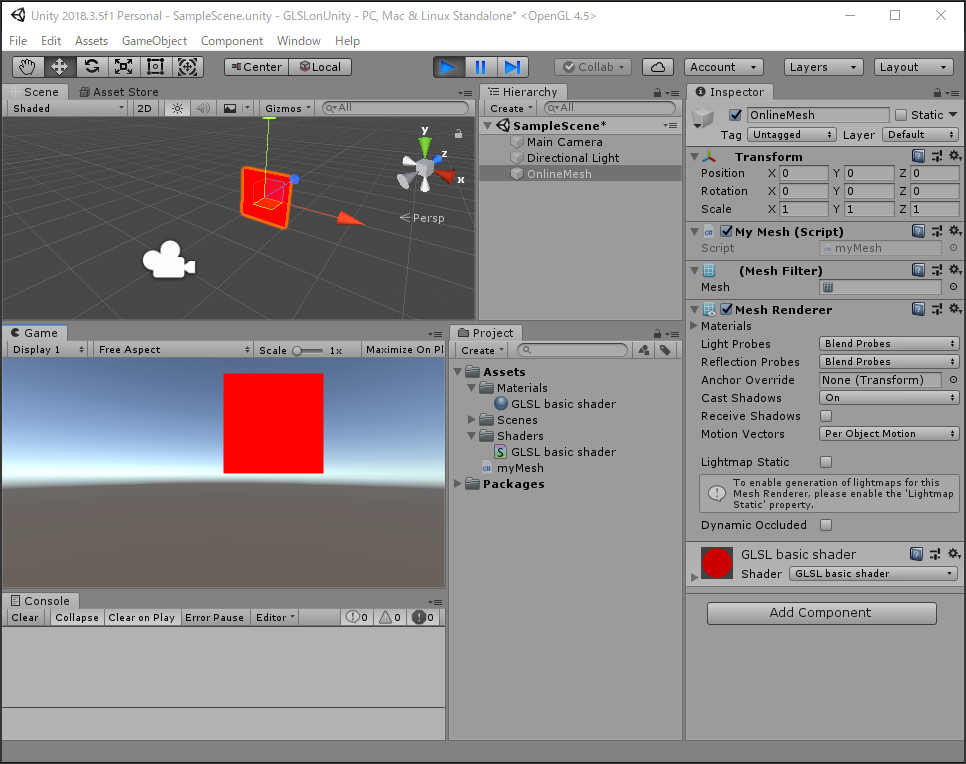 Mesh FilterとMesh Rendererも追加 - 前回同様,シェーダをドラッグ&ドロップでOnlineMeshに適用