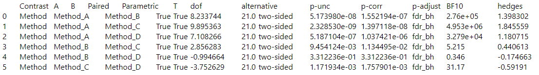 # ANOVA + the effect size # https://www.marsja.se/repeated-measures-anova-in-r-and-python-afex-pingouin/ aov = pg.rm_anova(dv="TCT", within="Method", subject="Participant", data=df_err, detailed=True) print(aov.round(2), "\n") # Perform multiple pairwise comparisons (t test) and corrections (Benjamini/Hochberg FDR correction) # https://www.reneshbedre.com/blog/repeated-measure-anova.html post_hoc = pg.pairwise_ttests(dv="TCT", within="Method", subject="Participant", padjust="fdr_bh", data=df_err) post_hoc