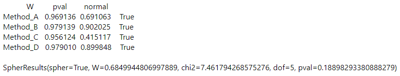 import scikit_posthocs as sp import pingouin as pg # Shapiro-Wilk test res_norm = pg.normality(data=df_tct, dv="TCT", group="Method") print(res_norm, "\n") # Mauchly’s test of sphericity res_sph = pg.sphericity(data=df_tct, dv="TCT", subject="Participant", within="Method") print(res_sph)